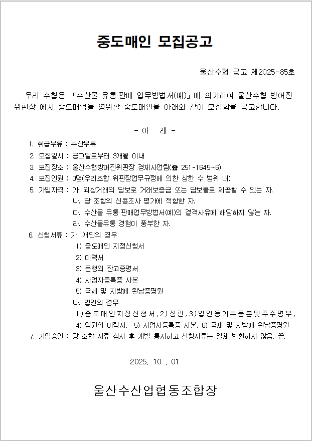 ¿ì¸® ¼öÇùÀº ¡¸¼ö»ê¹° À¯Å롤ÆÇ¸Å ¾÷¹«¹æ¹ý¼(¿¹)¡¹¿¡ ÀǰÅÇÏ¿© ¿ï»ê¼öÇù ¹æ¾îÁø À§ÆÇÀå ¿¡¼ Áßµµ¸Å¾÷À» ¿µÀ§ÇÒ Áßµµ¸ÅÀÎÀ» ºÙÀÓ°ú °°ÀÌ ¸ðÁýÇÔÀ» °ø°íÇÕ´Ï´Ù.